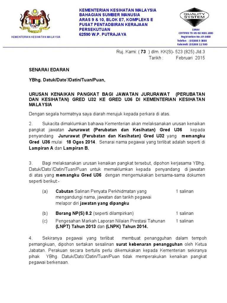 Rabu berkata pertambahan jururawat itu membantu kementerian kesihatan malaysia kkm dalam pengoperasian. Penangguhan tarikh lapor diri bagi pelatih latihan pra perkhidmatan institut latihan kementerian kesihatan malaysia (ilkkm). Surat untuk memberitahu keputusan lkppa / lkppp mengenai kenaikan pangkat pegawai.
